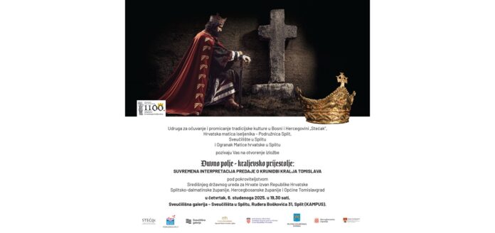 Udruga za očuvanje i promicanje tradicijske kulture u Bosni i Hercegovini „Stećak”, Hrvatska matica iseljenika – podružnica Split, Sveučilište u Splitu i ogranak Matice hrvatske u Splitu jučer je otvorila izložbu „Duvno polje – kraljevsko prijestolje: suvremena interpretacija predaje o krunidbi kralja Tomislava“, u Sveučilišnoj galeriji, Ruđera Boškovića 31, Split. Na izložbi su posjetitelji dobili jedinstven uvid u povijesno značenje i simboliku kralja Tomislava kroz suvremenu umjetničku interpretaciju.